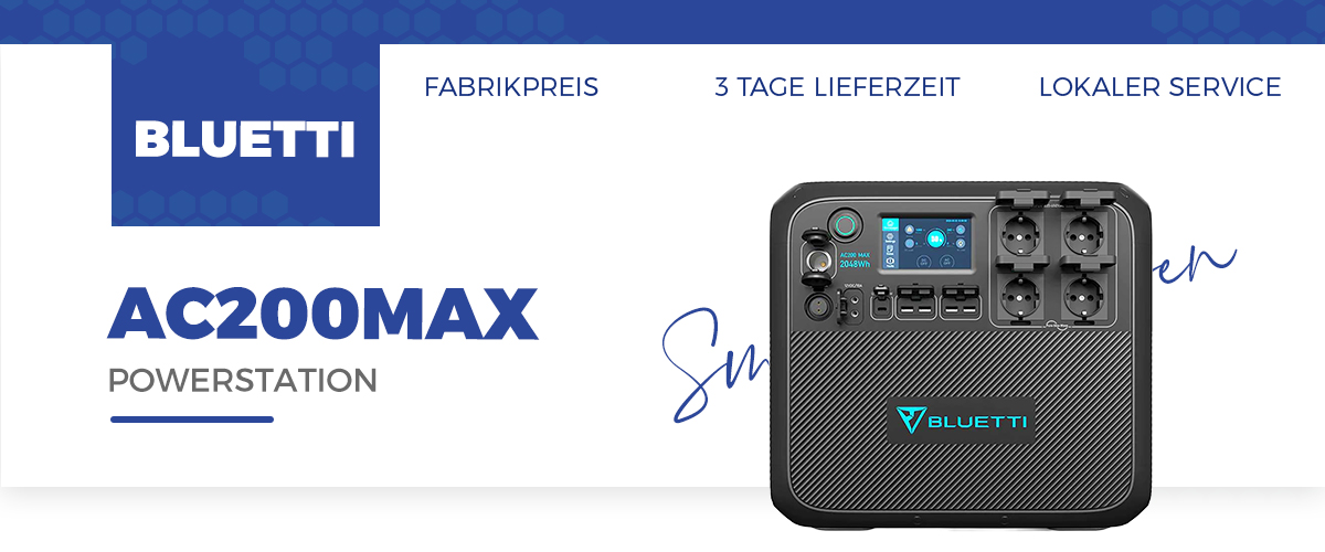 Es ist da: Das erste modulare, erweiterbare Bluetti Kraftwerk. Ausgestattet mit erstaunlichen 2048Wh ultra-robusten LFP-Zellen und einem 2.200W Volllast-Wechselrichter mit reiner Sinuswelle, kann der AC200MAX Ihr mobiles Aufladezentrum abseits des Netzes oder unterwegs sein.