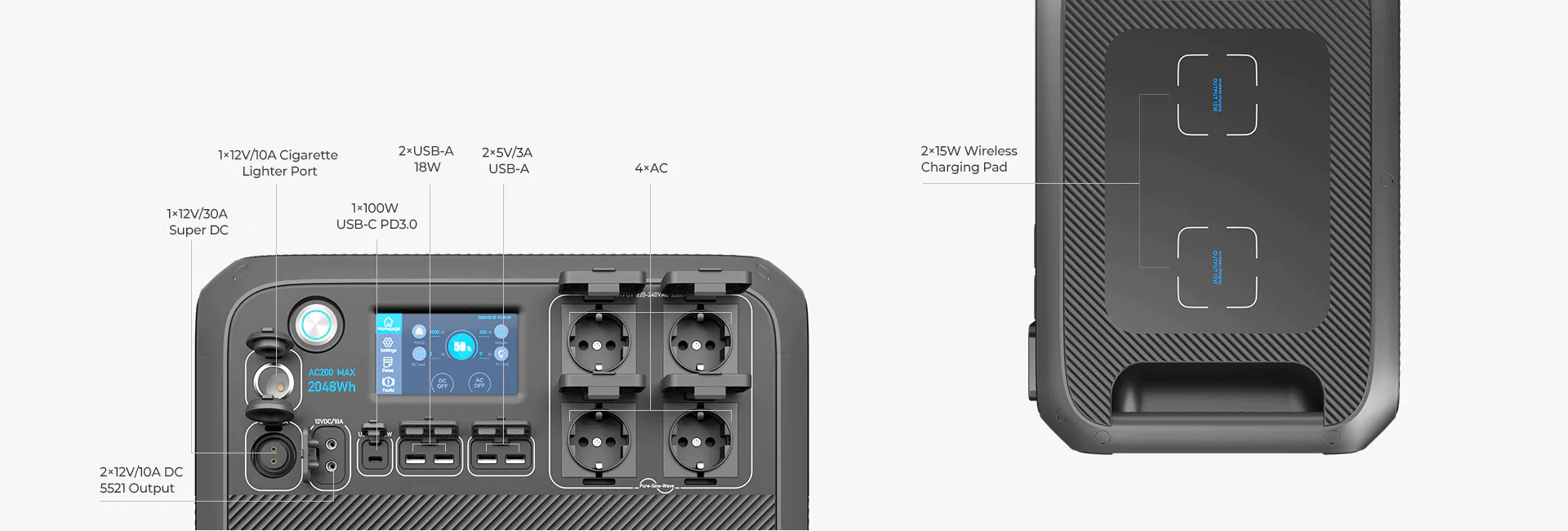 - Kapazität: 2048Wh für AC200MAX. LFP-Batterie mit einer Lebensdauer von 3500+ bis 80%.