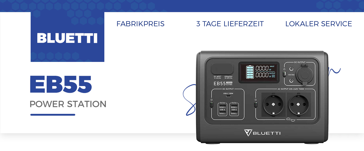 "Das kompakte und leichte Design macht die BLUETTI EB55 zu einer tragbaren Stromversorgungsstation, die sich perfekt für den Einsatz in einem Wohnmobil oder auf einem Campingausflug eignet. Mit einer Kapazität von 537Wh und einem eingebauten 700W (kurzzeitig bis zu 1400W) starken Wechselrichter, kann die EB55 die meisten Ihrer wichtigen Outdoor-Geräte und Elektronik wie Mobiltelefone, Mini-Gefrierschränke, Radios, Projektoren und mehr betreiben. "