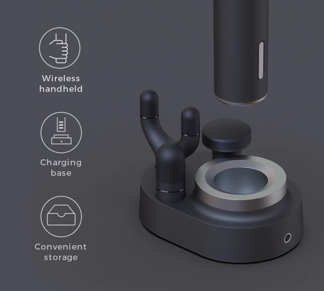 Der SlimElegant kann schnell aufgeladen werden, indem er in die untere Rille der Ladestation gestellt wird. Die innovative Ladestation mit Anti-Rutsch-Touch-Lack-Technologie, die den Körper der Massagepistole effektiv stabilisiert, um Stürze und Stöße zu verhindern, gewährleistet Sicherheit und Komfort. Außerdem ist sie platzsparend und leicht zu verstauen und hat ein modernes Design.